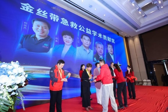 在随后的表彰环节中,主办方向五位主旨发言专家授予“金丝带急救公益学术贡献奖”奖杯,致敬他们多年来坚守公益科普一线的奉献精神。