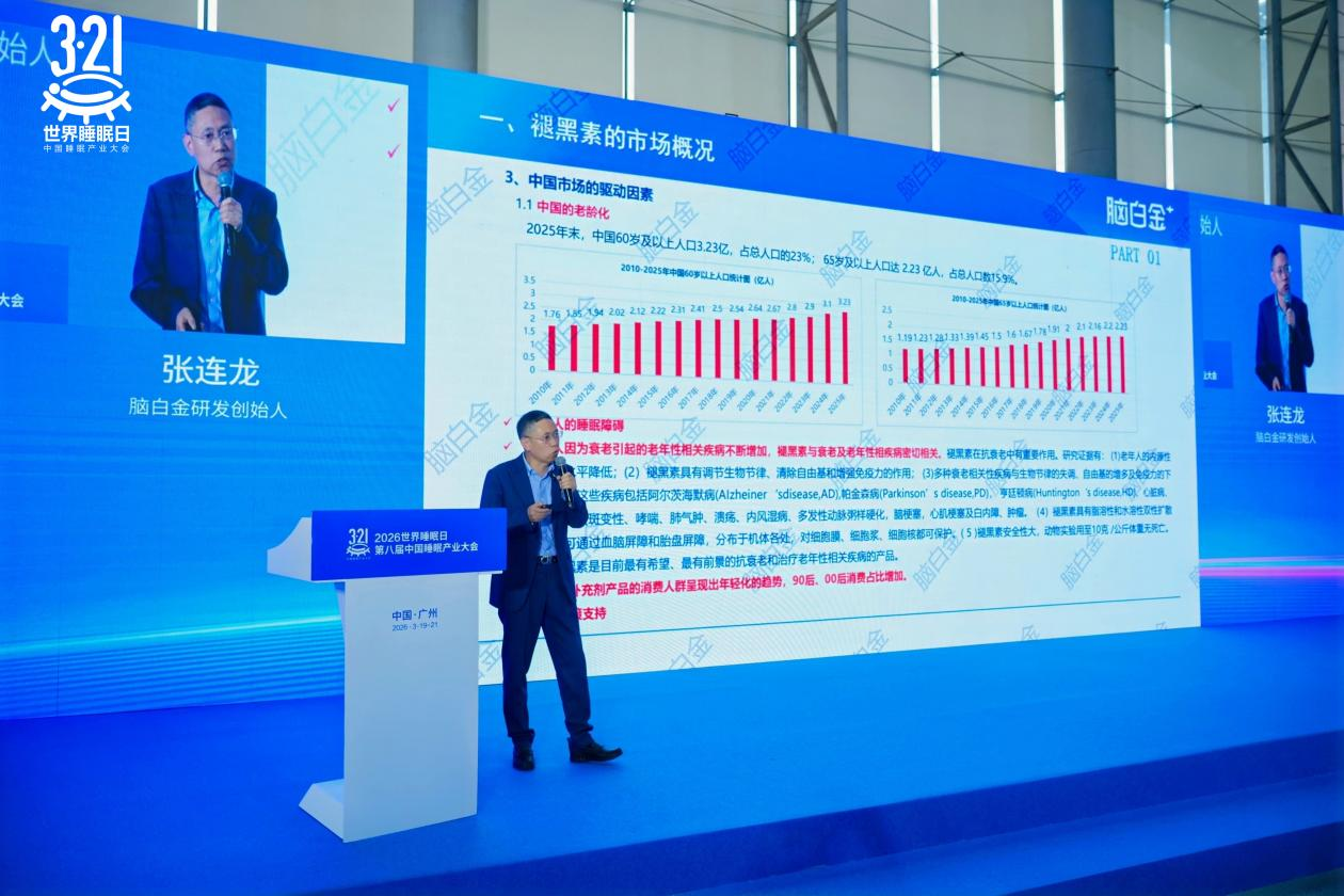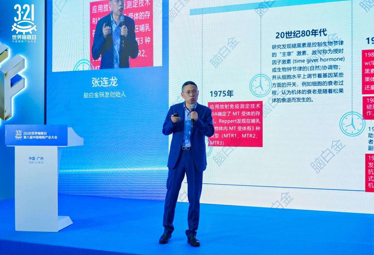 在大会演讲环节,脑白金研发创始人、注册营养师张连龙以《褪黑素及其爆品》为题,系统梳理了褪黑素的发展历程、生理作用机制及产业化应用。他指出,褪黑素作为人体内源性物质,在调节生物节律、清除自由基、增强免疫等方面具有多重作用。随着口服液、缓释制剂等新剂型的推广,褪黑素类产品将更精准地满足不同人群的个性化需求。