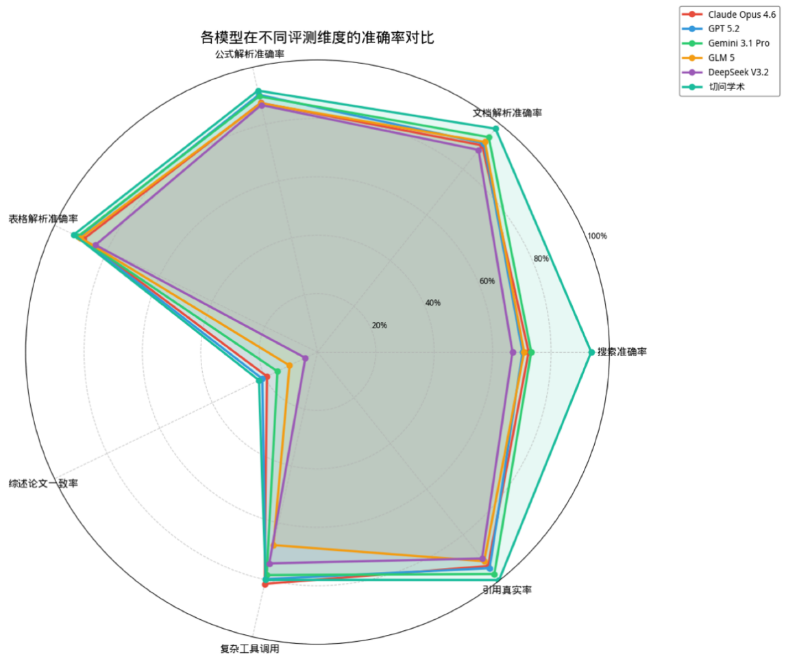 团队关于知识冲突的研究,入选了NeurIPS 2025 Spotlight,揭示了模型在记忆与现实冲突时的内部决策机制,为解决RAG“模型不听话”问题提供了理论支撑。关于AgentGym-RL的研究则为AI智能体构建了涵盖27个真实场景的“实战演习场”,提出ScalingInter-RL(从易到难的课程学习),让模型自主探索进化,打到让开源模型性能匹敌商用闭源大模型的效果,被ICLR 2026 大会报告接收为Oral。众多研究成果作为底座,最终让切问学术在第三方评测中的7个维度都交出碾压其他大模型的亮眼成绩单:搜索准确率(wispaper):93.78%(行业平均约70%),引用真实率(HalluLens-Cite):99.80%(接近零幻觉),文档解析准确率(ExtractBench):97.80%,公式解析准确率(OmniDoc-FR):91.79%。