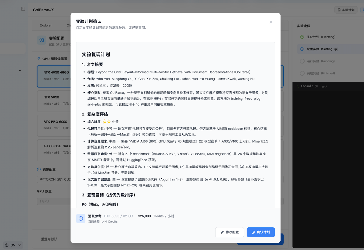 切问学术此次升级的核心——“全自动实验设计与执行”功能,具体而言是可以帮助科研人员在上传一篇论文后,完成从实验方式拆解、实验执行及实验结果复现的全流程。第一步:理解。 全自动解析论文的实验方法、实验逻辑,提取核心任务与算法。第二步:搭建。 自动匹配算力资源,搭建适用于该论文的计算机实验环境。第三步:执行。 真实编写代码并运行,自我修复可能出现的报错。第四步:报告。 最终形成完整的实验报告。据了解,切问学术在学术实验复现完成度上可实现90%以上的成功率。