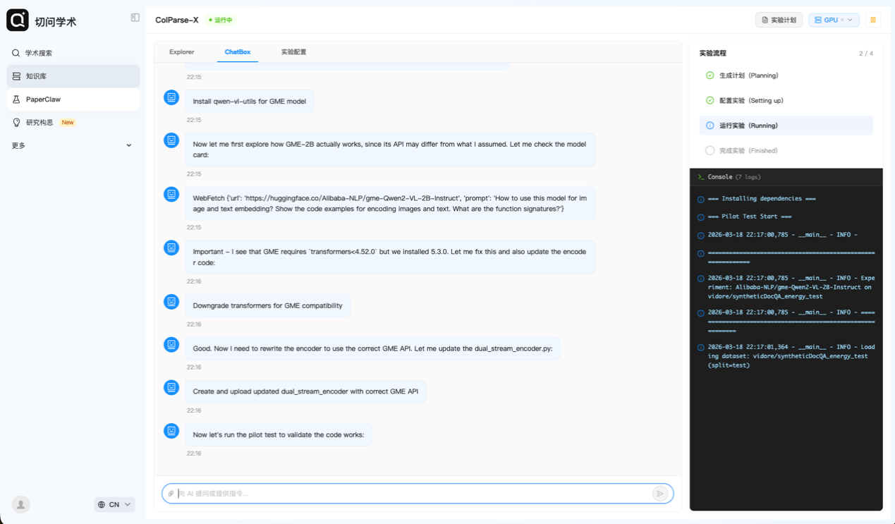 龙虾掀起了一场关于“智能体”的全民狂欢,当这一逻辑进入科研领域,一场更深层的变革正在发生。近日,由复旦大学自然语言处理实验室(FudanNLP)张奇教授团队创立的切问学术宣布重磅升级,正式上线了“全自动实验设计与执行”功能,标志着这款学术AI智能体实现了从传统科研“七步马拉松”到“智能体自动驾驶”的科研范式革命,科研全流程——从“想idea”到“验证idea”的最后一公里闭环由此打通。科研界,迎来了属于自己的“龙虾时刻”。