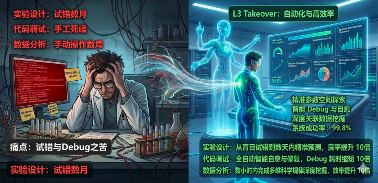 在AI4S领域,传统科研是一场极度严谨的“七步马拉松”:文献检索、研究现状分析、寻找空白、实验方案设计、编程实现、数据分析、论文写作。在这漫长的流程中,科学家将80%的精力消耗在繁杂的“重复性认知劳动”上,需要手动筛选论文库中的相关研究摘要、痛苦地Debug、一遍遍调格式。