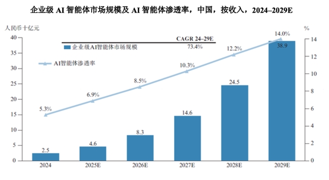 此外,弗若斯特沙利文报告显示,中国企业级AI解决方案市场2025至2029年的年复合增长率预计达42.7%,市场规模到2029年将达到2,780亿元人民币。其中,企业级AI智能体市场展现出强劲的扩张势头,2024至2029年复合增长率高达73.4%,市场规模到2029年将增长至389.1亿元。