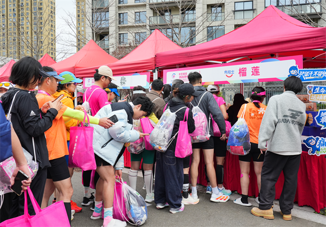 (图为马拉松跑者在市舶士展位排队领取榴莲补给)