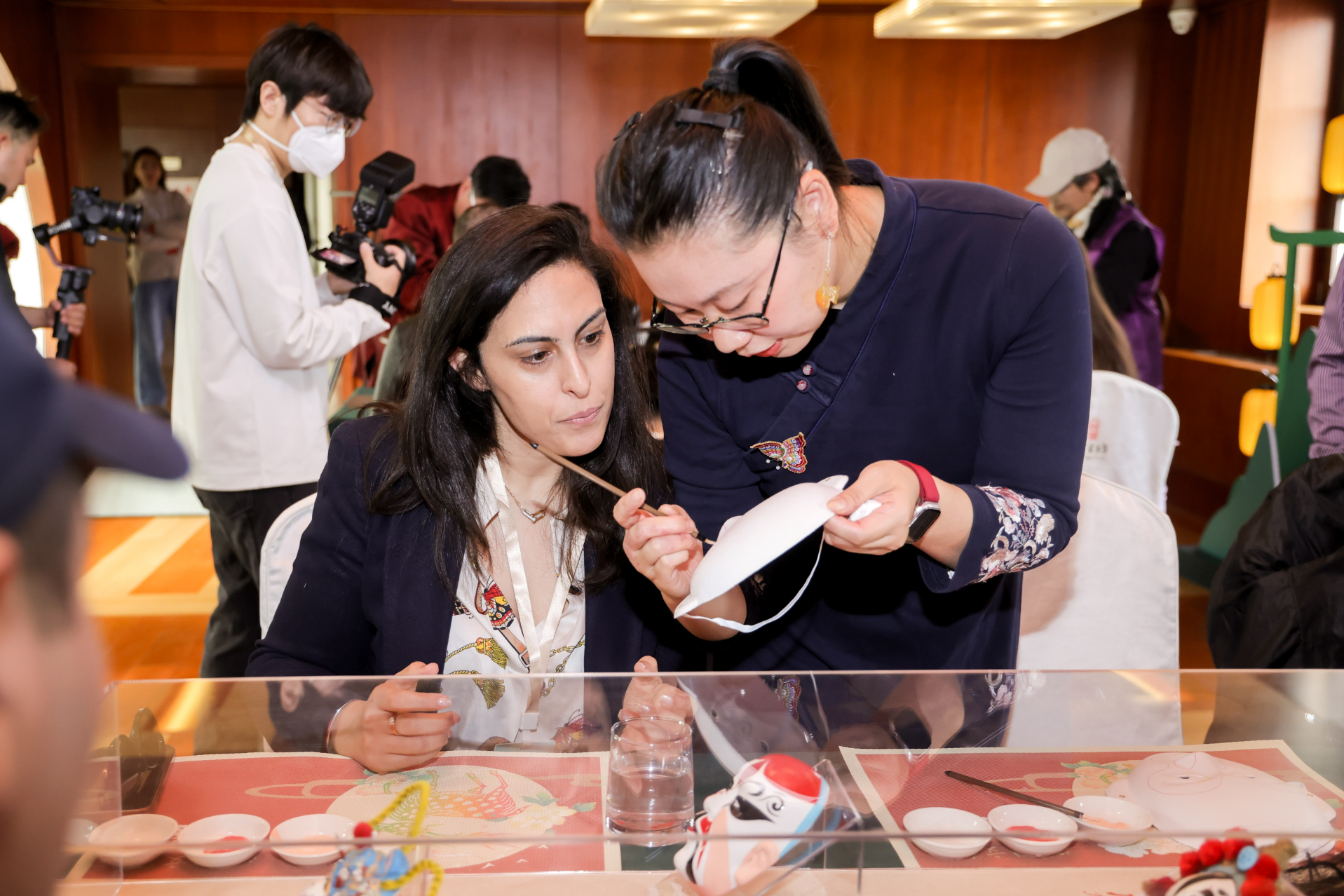 活动现场还设置了“你好,北京”图片展,为各国嘉宾生动呈现北京古今交融的城市景观。宋式点茶、彩塑京剧脸谱、北京鬃人、金氏风筝等非遗体验让各国使节沉浸式感受中国传统技艺的魅力。
