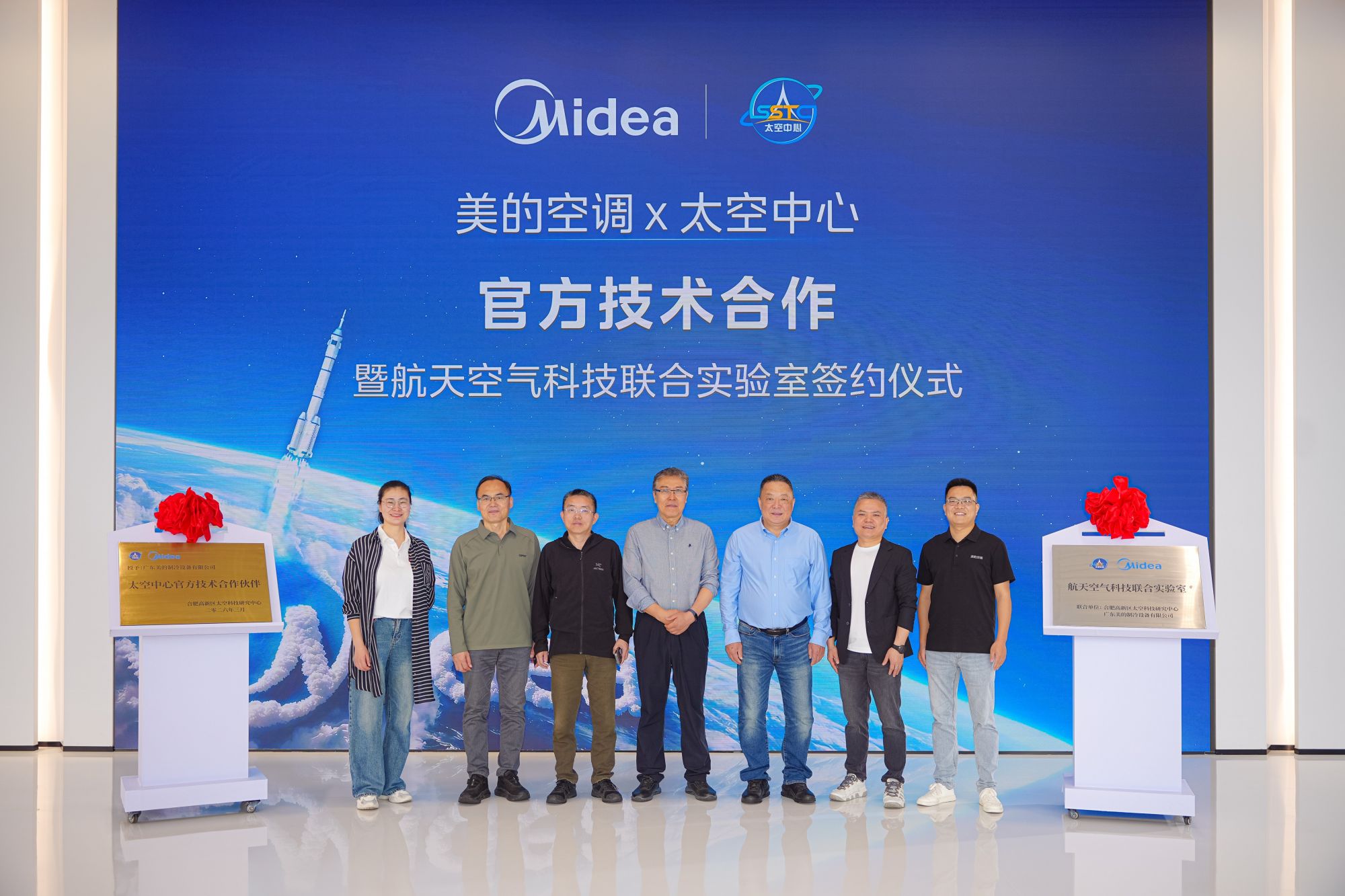 太空中心主任李庆龙、首席专家李潭秋等航天专家,与美的空调研发团队共同出席活动,签署合作协议并为“航天空气科技联合实验室”揭牌。