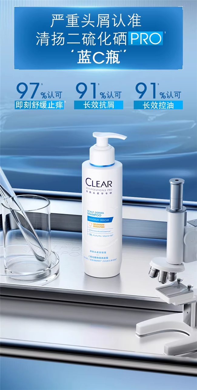 对于中重度脂溢性皮炎,仅靠普通日用洗发水往往力不从心。Mayo Clinic的建议中明确指出,含有硫化硒的洗发水是有效的非处方选择之一。清扬二硫化硒蓝C瓶的核心逻辑,正是围绕“皮肤学级”成分展开复配。