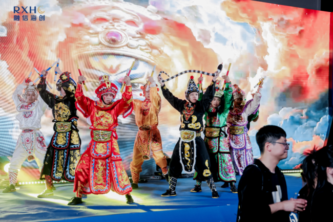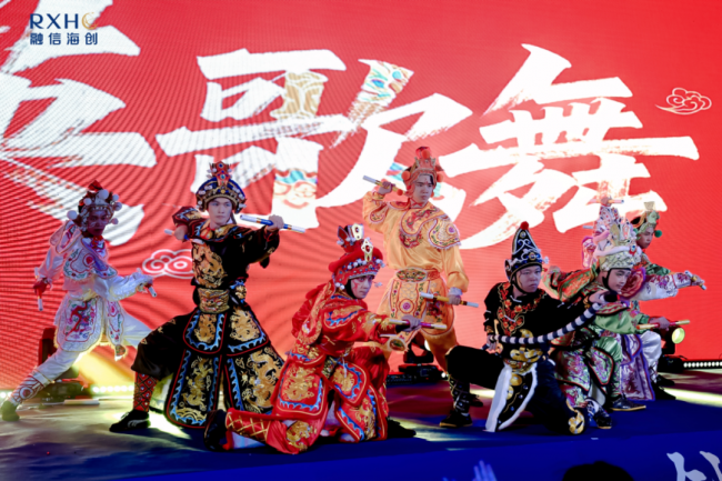 昂扬激越的英歌舞《元启英歌》登场,舞者们身着非遗文化潮汕英歌舞的传统服饰,以刚劲有力的动作展现昂扬向上的精神风貌。激昂的音乐和有力的舞姿都象征了融信海创在新的一年里必将继续勇往直前,乘风破浪。