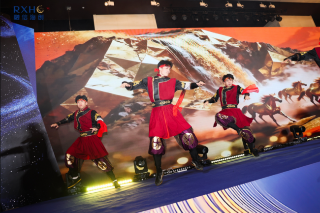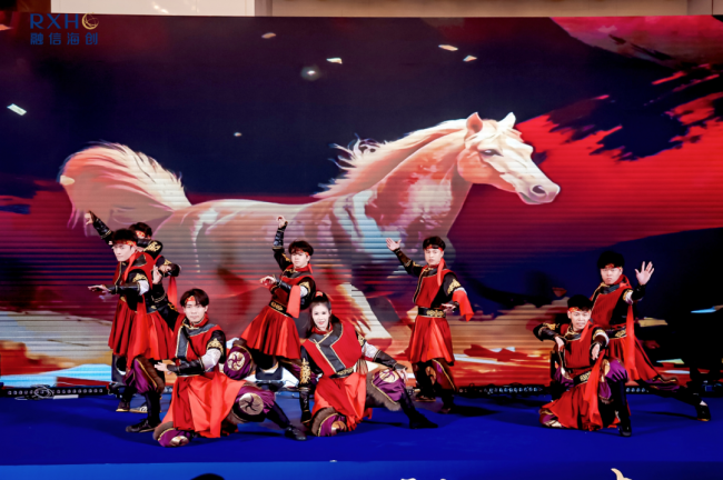 晚宴上,精心安排的歌舞表演环节也为现场增添了绚丽色彩。蒙古舞《万马潮舞》首先以豪迈奔放的舞姿点燃了全场热情,将草原儿女的豪迈气魄展现得淋漓尽致,仿佛将现场带到了广袤无垠的大草原。