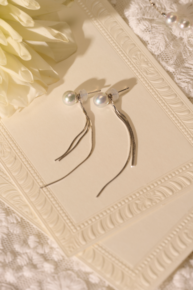 针对春日里频繁切换的社交场景,“月光海-银锻舞会耳环”给出了极具巧思的搭配解决方案。该耳环臻选真多麻色AKOYA珍珠,其自带银灰冷调的高级光泽,与质感流动的银质流苏线条相映成趣。流苏在春日阳光下折射出细腻多变的光影,为耳畔注入精致灵动的韵律感。且它的点睛之笔在于耳环的可拆卸设计,实现一饰两戴,可根据春日下午茶、踏青、约会等不同场景灵活切换造型,既省去多件配饰的携带麻烦,又能轻松打造多样化造型,让每一次春日邂逅都自带高光。