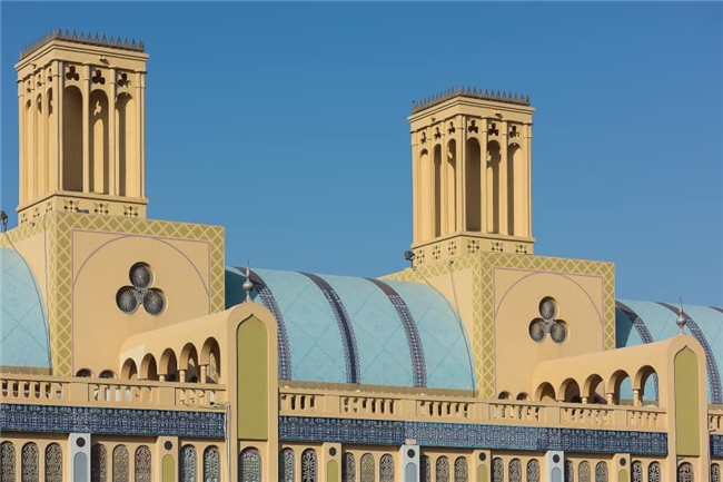 中央市场大规模保留了传统阿拉伯集市的风貌。两栋平行建筑通过多条室内廊桥相连,结构对称有序,拱顶华丽精致,20座风塔勾勒出独特的天际线。