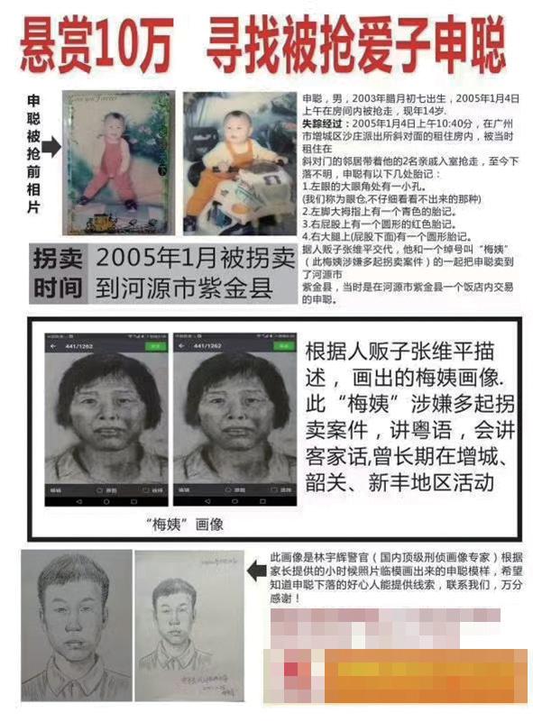 人贩子张维平、周容平落网之前,申军良的寻人启事上只有孩子的照片和名字。2017年,广州警方根据张维平的供述,公示了一张“梅姨”的画像,申军良就在寻人启事上加上“梅姨”的照片,他要找孩子,找“梅姨”。