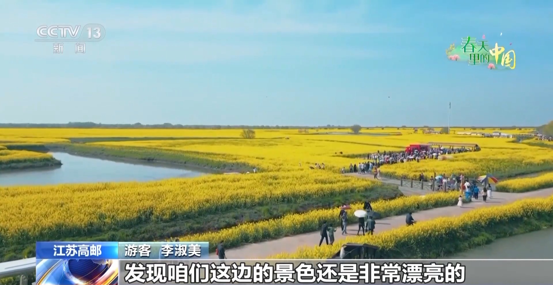 游客 李淑美:这边景色非常漂亮,全场一片金灿灿的,它还有一个特别壮观的景色,跟高邮湖相接的地方,适合打卡拍照。