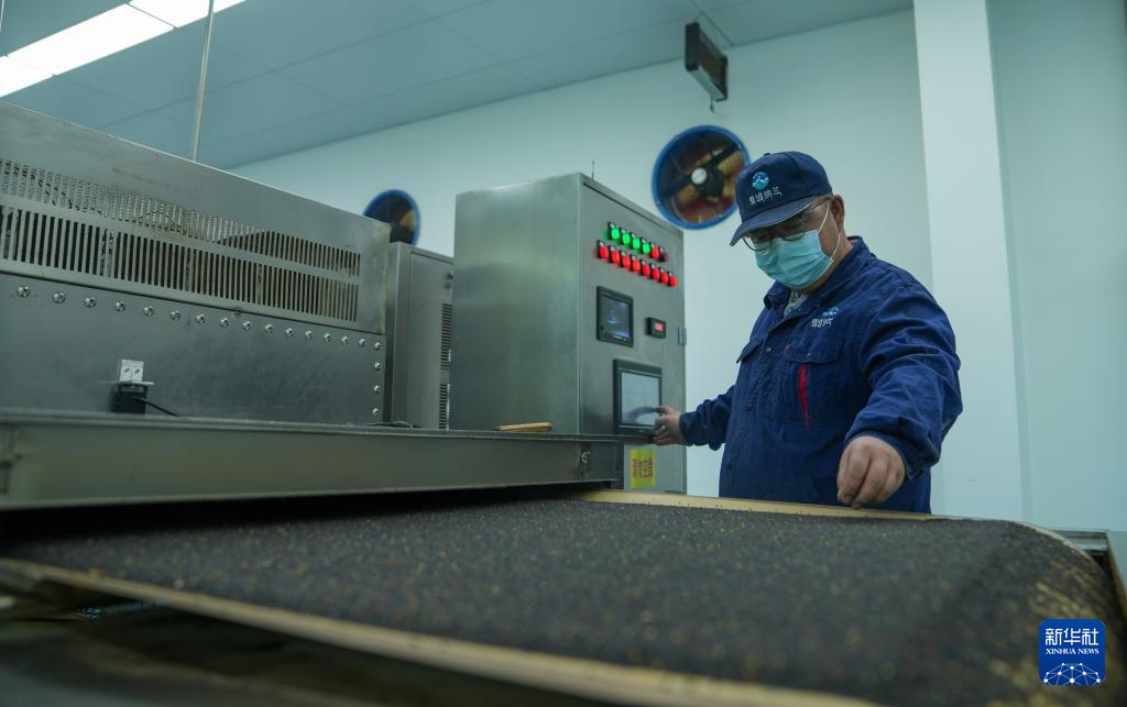 西藏山南市扎囊县重点招商引资企业——西藏纳兰生态产业有限公司工作人员操作微波烘烤设备制作食用油(3月17日摄)。新华社记者 晋美多吉 摄