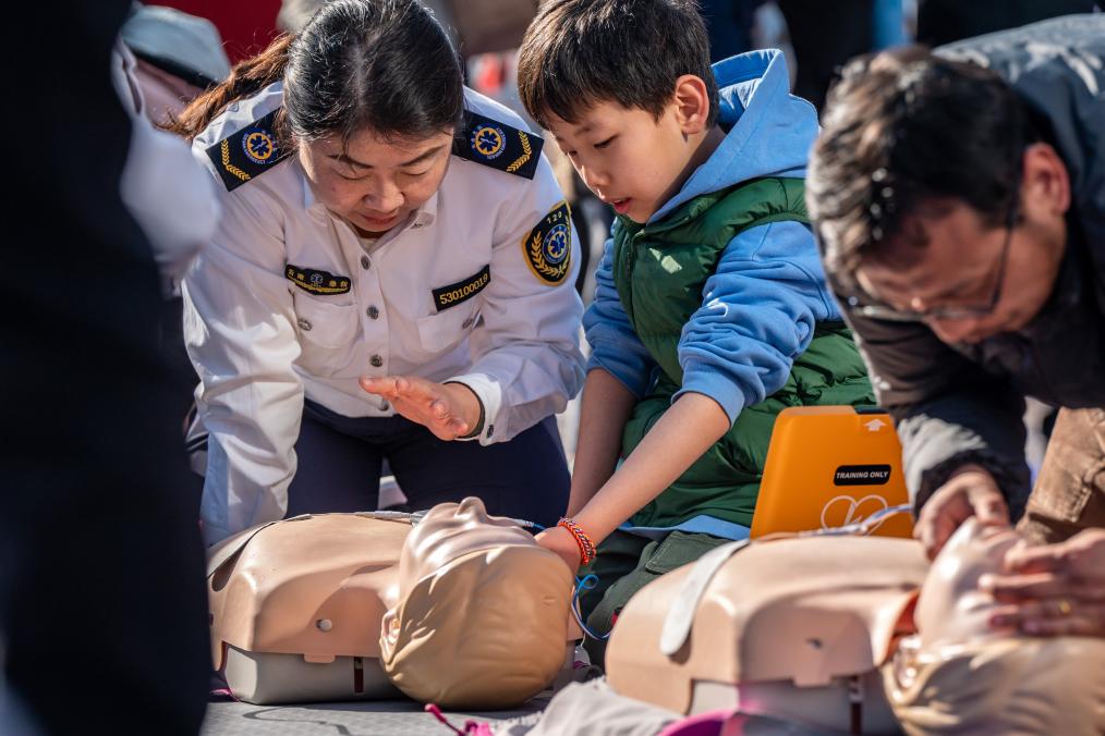 云南省急救中心的医师讲授心肺复苏方法技巧。新华社记者 胡超 摄