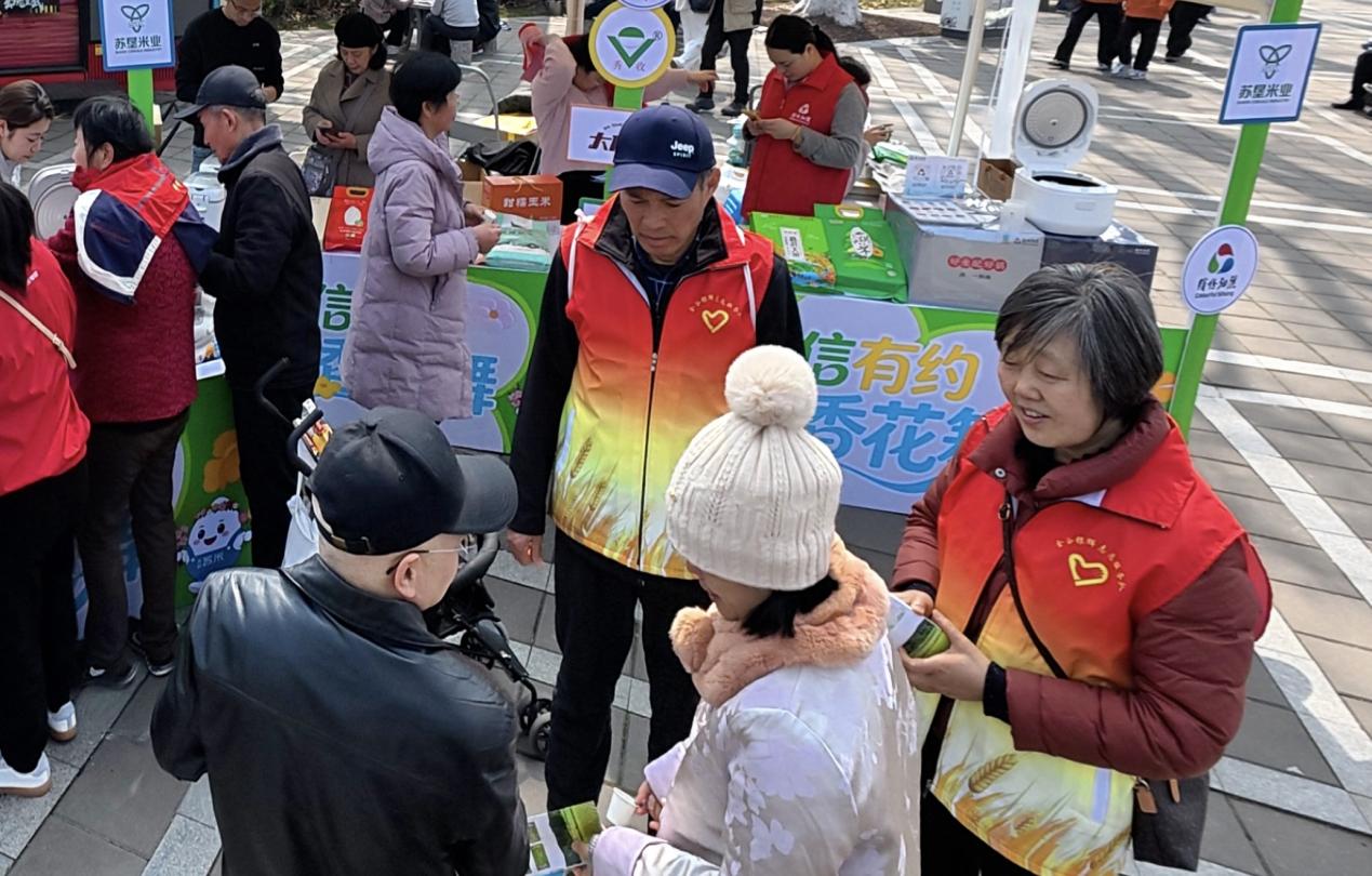 活动现场中,南京(国家)粮油商品交易市场工会、江苏省粮食和物资储备局“金谷银辉”志愿服务队等充分发挥粮食领域的专业优势,向来往的市民游客积极宣传“水韵•苏米” 公用品牌,在活动展示区想群众讲解“水韵·苏米”种植优势、营养价值、品质特点,发放宣传手册并协助开展爱粮节粮、粮食安全知识科普活动。江苏省粮食和物资储备局“金谷银辉”志愿服务队的老党员志愿者们充分发挥自身深耕粮食领域的专业优势、经验优势、银发优势,走上一线、服务群众,向来往的市民和游客积极宣传“水韵•苏米”公共品牌,助力核心企业推广优质大米,用实际行动践行雷锋精神,为守护粮食安全、助力乡村振兴、讲好江苏粮储故事贡献余热力量。