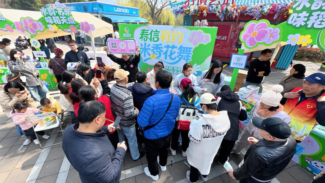 活动紧扣春分时节与“桃花”主题,契合春耕时令特色,吸引众多游客驻足打卡。活动相关负责人表示,“水韵·苏米”选择玄武湖这一城市地标举办活动,旨在让江苏好大米走进市民生活、融入城市记忆,唤起人们对粮食的敬畏之心与珍惜之情。