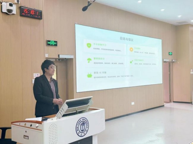 针对当前校园高发的金融网络风险,讲师重点开展防非反诈专题教育,深入剖析AI变脸诈骗、非法金融中介、校园贷、银行卡跨境盗刷等典型陷阱,播放了教育宣传视频,从“零门槛、无抵押、高回报”的校园贷套路到“AI换脸拟声伪造身份诱导紧急转账”,从非法中介诱导“代理退保”“代理维权”到电信诈骗精准围猎,逐一揭露作案手法与防范要点,提醒学生不轻易相信、不随意透露信息、不进行转账操作,多进行核实,坚决远离非法金融活动,守护个人信息与财产安全。