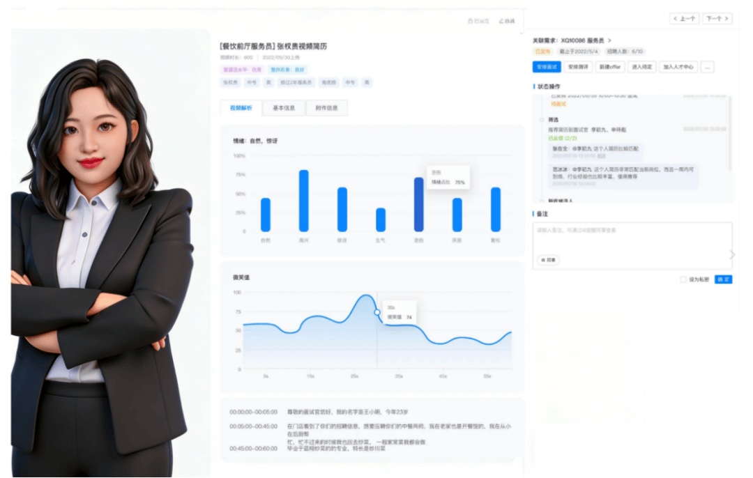 候选人上传视频简历后,系统自动进行智能解析:一方面,提取简历中的核心关键词(如工作经历亮点、技能掌握程度);另一方面,精准分析候选人的情绪变化、表达流畅度、面部表情等维度数据。面试官无需与候选人反复沟通,即可通过视频简历直观了解其表达能力、综合素质,快速判断岗位适配度。