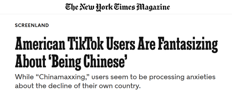 美国《纽约时报》日前刊文称,“Becoming Chinese”(“成为中国人”)“Chinamaxxing”(“极致中国化”)等话题在海外社交媒体上火爆异常,大量网友模仿并表示自己爱上了中国人的生活方式。文章认为,电动汽车、医疗保障、高速铁路,这些先进事物逐渐揭开了中国生活的神秘面纱,也让中国成为新一代旅游胜地——一个兼具超凡脱俗的自然风光与现代科技的神奇的地方。在“极致中国化”体验过程中,西方网友们似乎在消化对本国衰落的焦虑情绪,美国民众们仿佛能从这些视频片段中看到一种尚未在本土实现的未来图景,在他们看来,中国人高品质、低成本的生活,穿着拖鞋、滋养脾胃的日常,应是人人都能享有的生活常态。