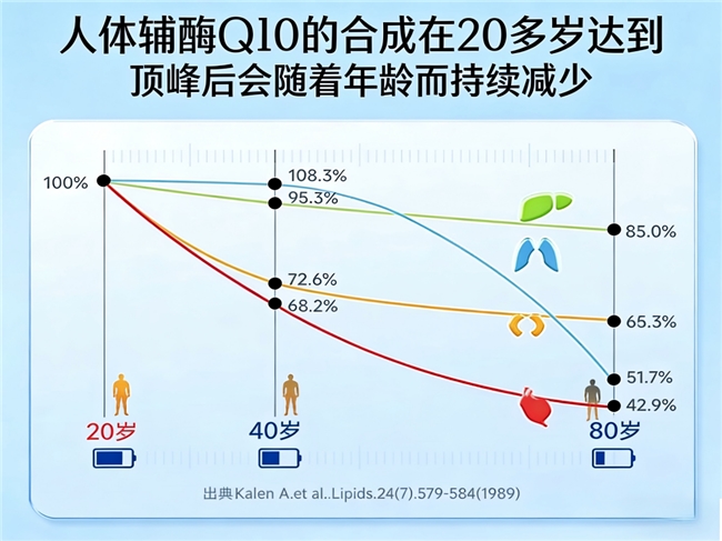 人体内的辅酶Q10水平并非一成不变。随着年龄增长,辅酶Q10水平会自然下降。研究表明,人体内辅酶Q10含量在20岁左右达到高峰,之后逐渐减少,到40岁时下降更为明显②。心脏中的辅酶Q10浓度减少尤为突出⑧。