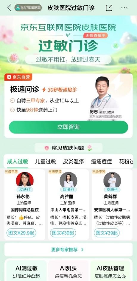 目前,京东互联网医院耳鼻喉中心汇集全国近2000名三甲医院医生,皮肤医院过敏门诊则汇聚超3000名皮肤科专家,平均30秒快速接诊。针对春季过敏常伴随的“眼睛痒、打喷嚏、流鼻涕、皮肤起疹”等多系统症状,多学科医生可同步调阅病历、共同制定方案,让用户足不出户即可完成跨科室咨询,避免奔波与交叉感染风险。