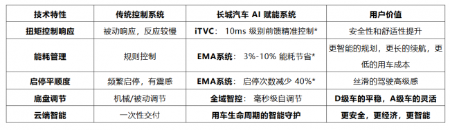 在车端智能化层面,长城汽车重点介绍了全栈自研的智能能量管理EMA,iTVC智能扭矩矢量控制系统和全域智控AI底盘。以下数据直观展现了AI赋能动力底盘控制后的体验跨越: