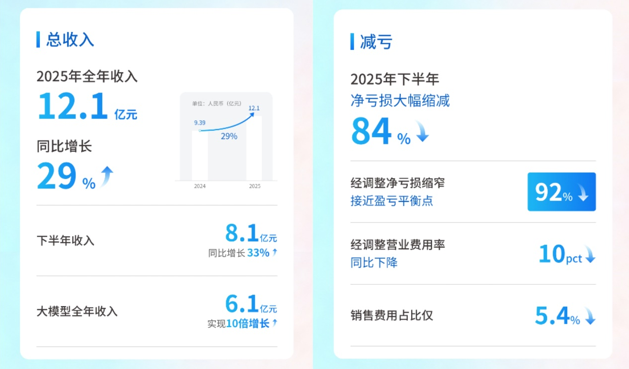 2025年全年,云知声实现总营收12.1亿元人民币,同比增长29%。其中,下半年收入同比增长33%,达8.1亿元。
