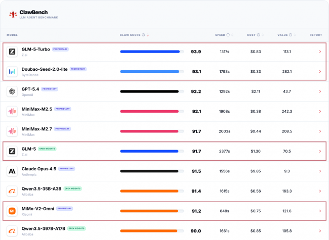 在本次发布的核心能力CLAW SCORE榜单中,北京企业实现历史性领跑,在全球头部阵营中形成集群式优势。CLAW SCORE以模型全场景评测任务的完成率为核心指标,分值越高代表模型的综合任务解决能力越强。其中,智谱旗下GLM-5-Turbo模型以93.9的高分登顶全球榜首,成为当前全球智能体能力最强的大模型;同属智谱的GLM-5模型以91.7分位列榜单第6位。字节跳动旗下Doubao-Seed-2.0-lite模型以93.1分稳居全球第二,与榜首仅相差0.8分,是全球仅有的两款评分突破93分的模型之一。小米集团旗下MiMo-V2-Omni模型以91.2分位列榜单第9位,成为消费电子企业入局通用人工智能领域的标杆成果。三家北京企业共计4款模型跻身全球前十,在榜单头部阵营中占据近半席位,全面超越OpenAI GPT-5.4、Anthropic Claude Opus 4.5等海外顶尖模型,实现了中国AI企业在全球智能体评测领域的全面领跑。