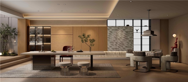 整个展馆被设计为四幕剧场。“浮光剧场”是序章,材质本身的语言在入口处便已铺陈;“繁花剧场”里,五境花色在圆形展台上如花绽放——盛境的同步对纹让木纹触感如真实木材般温润,雅境在克制中传递对自然与时间的敬意,石境记录着地质生命的记忆,艺境将牡丹纹与金玉元素融合,云境的素色澄明则让空间回归纯净的呼吸感;“材艺剧场”中,侘寂风、意式风、中古风、奶油风、宋式美学五个微型场景依次展开,新港用门墙柜地一体化同色系统,让五境在不同风格中自由流动;“和鸣剧场”洽谈区,一面荣誉墙记录着新港33年的技术积累。