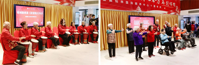 活动期间,在住长辈们也积极参与其中,充分体现着他们的生活热情——庆典在爷爷奶奶们的非洲鼓表演中热闹启幕,又在长辈合唱队深情献唱中结束。