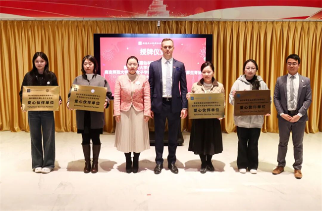 同时,为感恩社会各界志愿者的长期陪伴与无私奉献,欧葆庭为南京审计大学金审学院校心理协会、南京财经大学工商管理学院、南京师范大学金陵女子学院/社会学院/会计学院厚生青协、南京国际外籍人员子女学校四家爱心伙伴单位颁发荣誉铜牌,铭记公益路上的温暖同行。