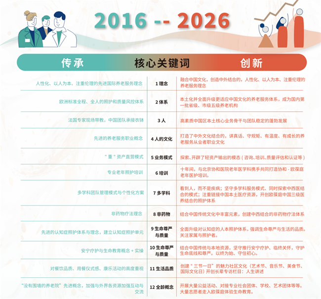 2016年,欧葆庭仙林国际颐养中心正式开业。十年来,我国养老服务行业已经形成了事业与产业的双重发展,中国老年人的晚年生活得到了越来越多的保障。欧葆庭也在这段时光中,成为长期住满、一床难求的养老服务标杆机构。2026年,匆匆十载初心不改,欧葆庭围绕养老服务的十二大核心关键词,从“传承”与“创新”两个方面着手,总结过去十年来的坚守与突破。