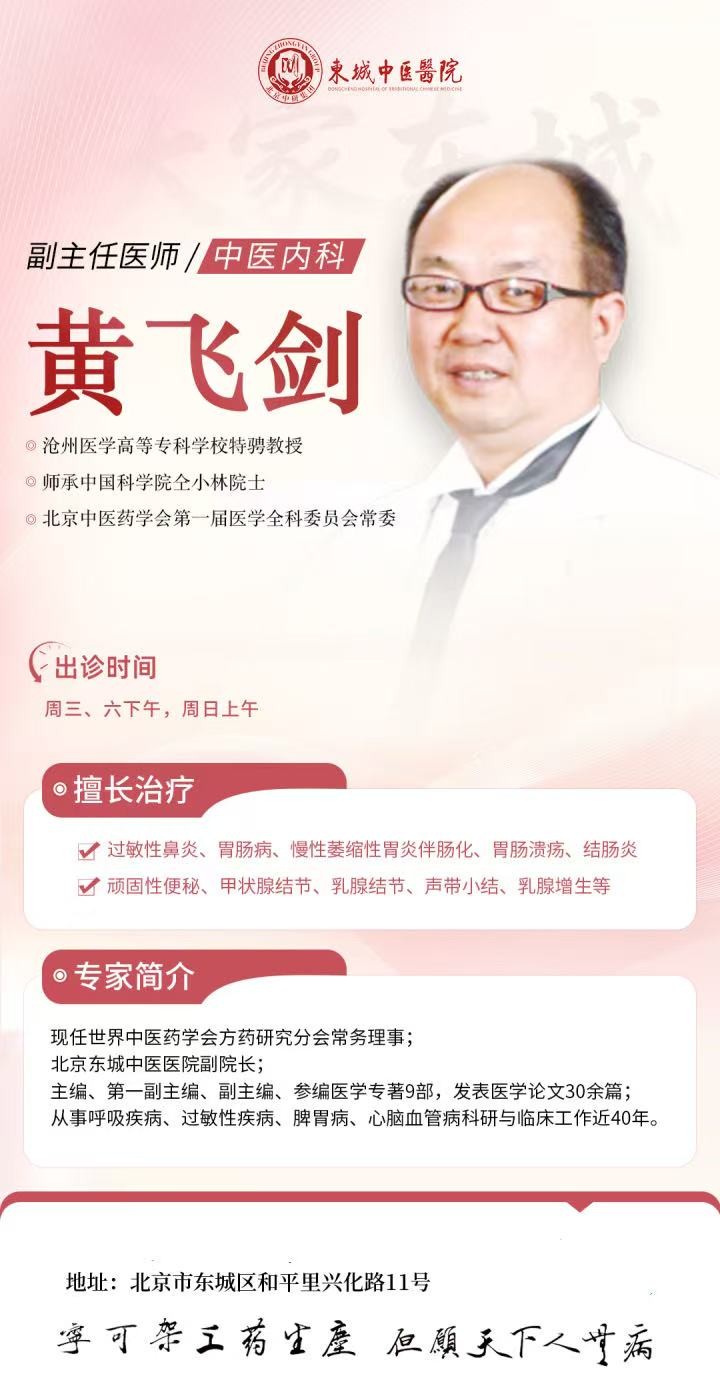 黄飞剑,副主任医师,北京东城中医医院副院长,出诊时间周三、周六下午,周日上午。沧州医学高等专科学校特骋教授,师承中国科学院仝小林院士。任主编,副主编,参编医学专著九部,任第一副主编的《脏腑风温论》获得中华中医药学会2023年度科技著作一等奖。擅长治疗:过敏性鼻炎、胃肠病、慢性萎缩性胃炎伴肠化、胃肠溃疡、结肠炎、顽固性便秘、甲状腺结节、乳腺结节、声带小结、乳腺增生、胆息肉、肠息肉、前列腺增生、冠心病、慢性心衰、各种斑块、高脂血症、高尿酸血症、高血压病、低血压病、贫血、中风后遗症、糖尿病及其并发症等病。