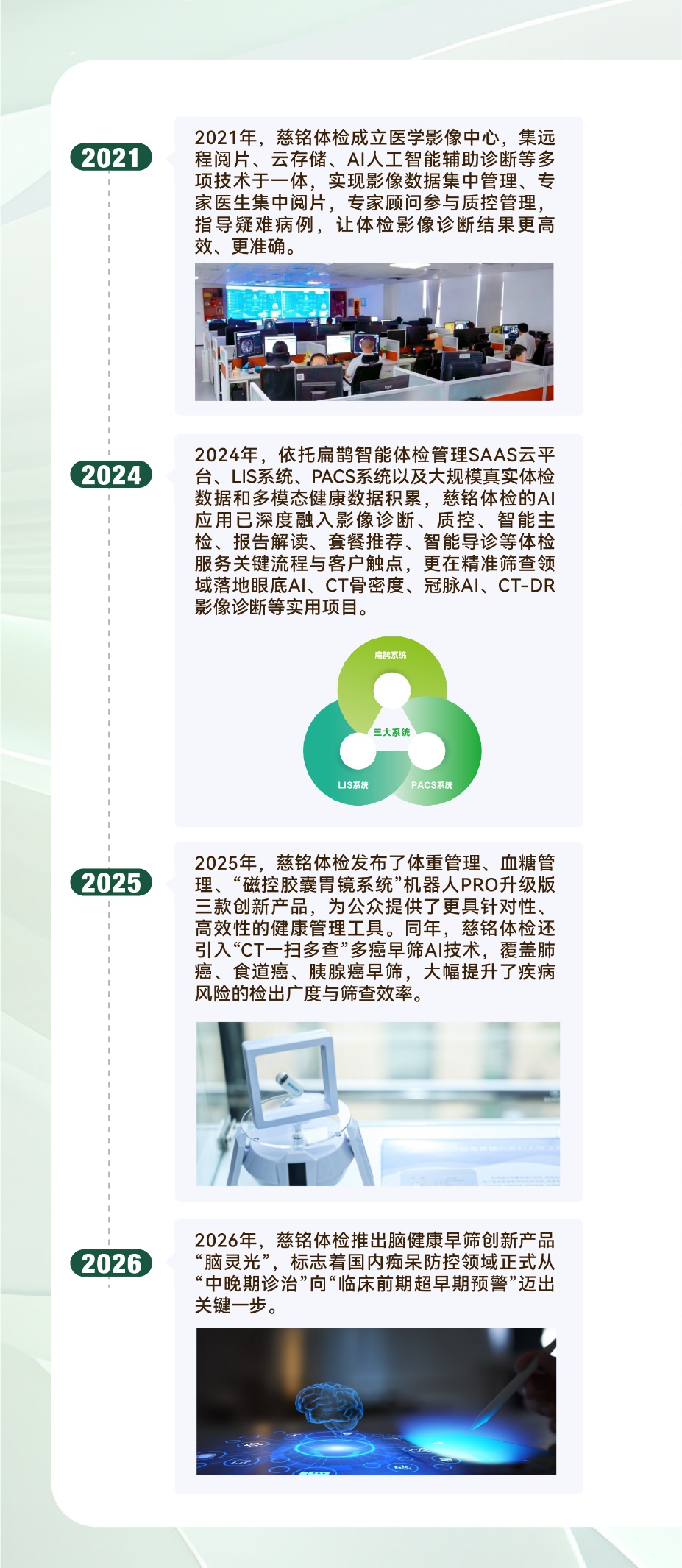 在健康中国战略背景下,慈铭体检顺应大健康产业从疾病治疗向健康预防的结构性变革趋势,率先实施“All in AI”战略,将人工智能深度融入体检与健康管理全流程,构建起检前风险评估、检中智能诊断、检后健康干预的全周期服务闭环,并围绕癌症早筛、慢病管理、脑健康筛查、心血管筛查等重点领域,推出一系列“专精特新”创新产品。