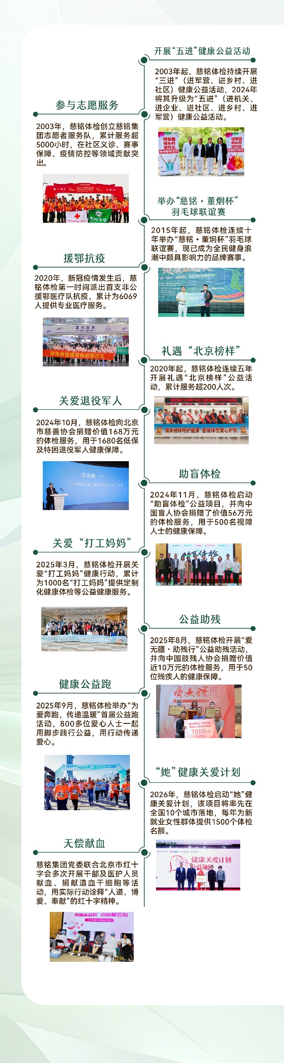 二十四年来,慈铭体检始终牢记“守护中国人的生命健康”的使命,在成为行业知名品牌的同时,积极践行企业社会责任,坚持开展公益事业,累计开展公益活动过千场,不仅为退伍老兵、北京榜样、残障人群、打工妈妈等多群体进行公益体检等健康服务,还将公益服务延伸至贫困地区、病患群体,连续多年捐赠医疗设备,广泛开展献血、捐献造血干细胞志愿活动。