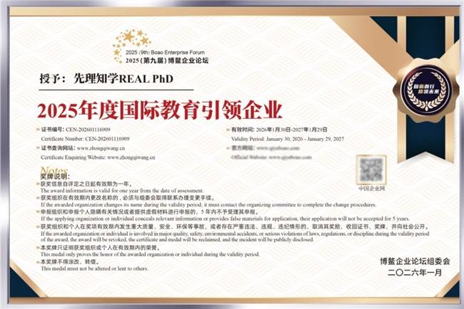 至今,先理知学REAL PhD已助力逾万名中国学子入读海外博士项目。其专业积累也获得广泛认可:新浪&微博教育“2024 年度国际教育领导力品牌”、央广网教育“2024年度影响力留学服务品牌”、福布斯中国“2025留学出国服务卓越品牌”、胡润“年度国际化教育影响力品牌”以及博鳌“2025年度国际教育引领企业”奖项;在国际层面,获BOC Global颁发的“International Brilliance Awards”、IE 100 Awards颁发“International Education Leadership Brand of The Year”奖项,并荣获全球国际教育领域权威机构ICEF认证。