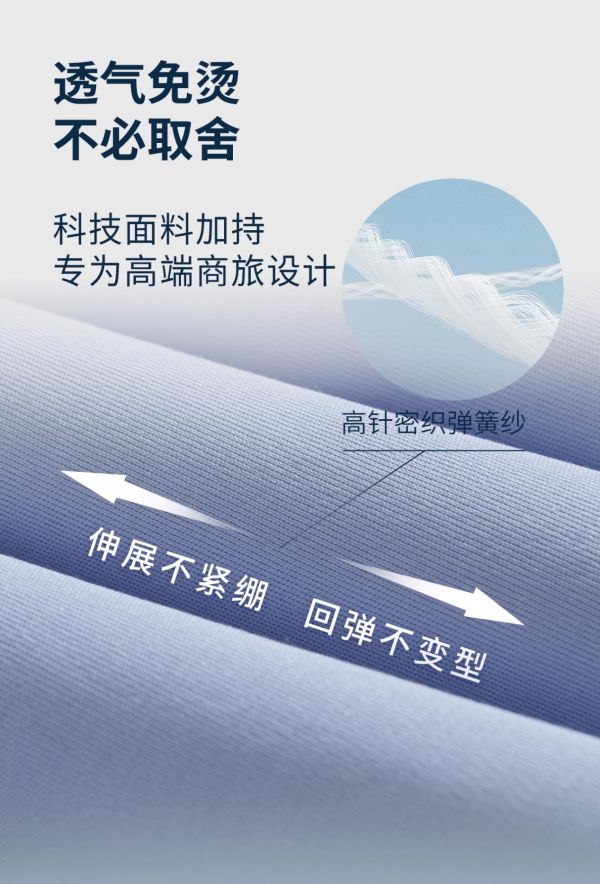 在确保活动自由方面,欧定新一代衬衫延续了一贯的“高弹”基因并进行了强化。通过将120支超长棉纤维与8倍高弹科技纤维精密结合,形成了稳固的弹性“骨架”,使得衬衫在经向与纬向都拥有远超普通产品的拉伸性能,经数万次弯曲仍能保证大幅活动时的无束缚感与快速回弹。此外,为解决领塌易皱,藕丁使用0重力回弹定型工艺与内外弧回弯工艺,打造机翼动力学高弹领,让领型久穿坚挺不塌陷。同时欧定头等舱高弹衬衫使用高针高密工艺与9条衣骨支撑,让衬衫挺括且免熨,兼顾体面与便捷。
