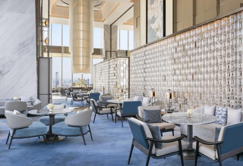 酒店设有204间客房与套房,均位于48层及以上,全景视野可尽览长江壮阔与城市天际,与综合体超甲级写字楼的云端办公视野形成呼应。客房以“云端居所”为理念,蓝白银色主调搭配樱花灯饰、纸雕艺术等楚韵细节,尽显雅致格调;270平方米套房以私邸尊享格调,为宾客群提供宁静而尊崇的居停体验;行政楼层宾客可专享56层行政酒廊,每日五次精致餐饮礼遇,为商务洽谈、圈层交流提供高端场景。此外,丽思儿童项目通过趣味互动,引领家庭客群领略武汉文化底蕴,让服务覆盖全龄层。