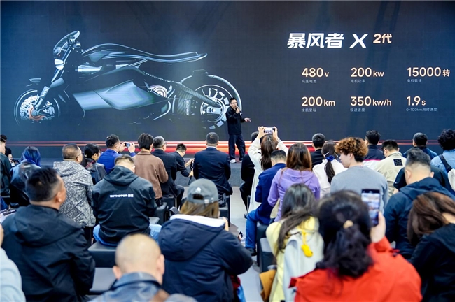 首日开展不到一小时,首驱科技便在新品发布会上完整呈现了T、S、K、Y、O家族图谱及搭载的十余项行业首创技术,覆盖从高性能电摩到智能电自的多品类矩阵。其中,搭载F1同源技术的“暴风者X二代”以350km/h极速、1.9秒零百加速及55.99万元售价,引发全场轰动。