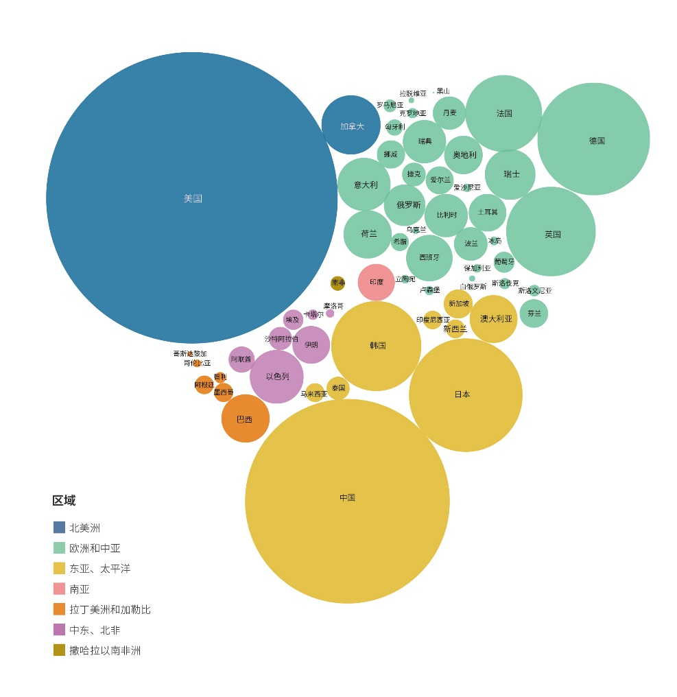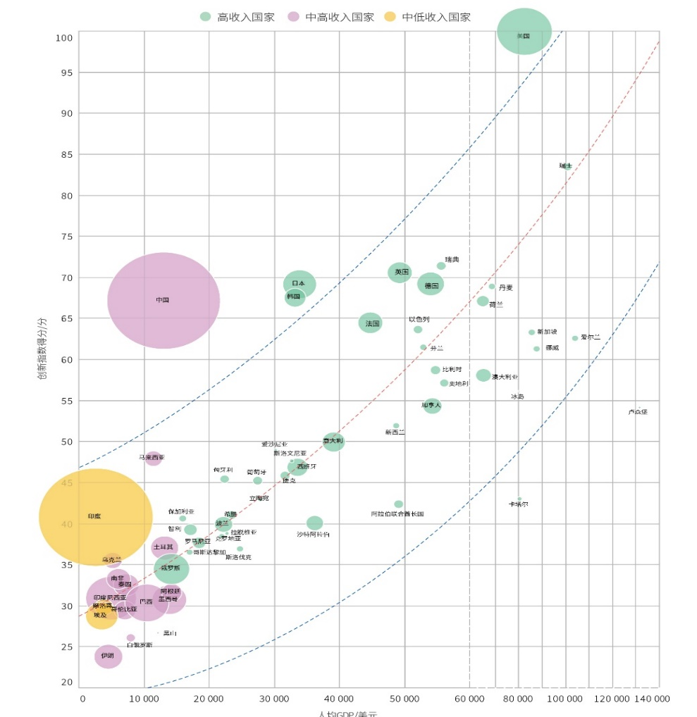 △各国人均GDP与国家创新指数得分(注:圆圈大小代表人口规模)