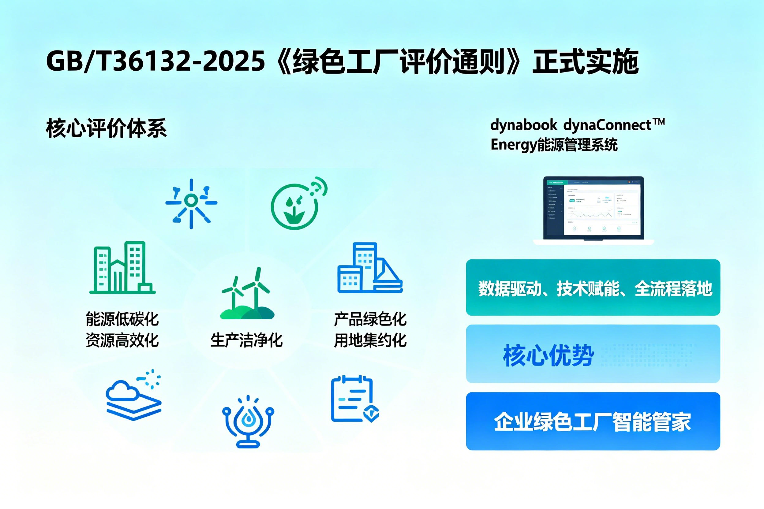 2025年12月31日,GB/T36132-2025《绿色工厂评价通则》正式实施,标志着我国绿色工厂建设进入标准化、精细化新阶段。新国标以“能源低碳化、资源高效化、生产洁净化、产品绿色化、用地集约化” 为核心评价体系,强化了碳排放强度、可再生能源利用率、碳足迹量化等关键指标的考核要求,为企业绿色转型划定了明确方向。dynabook深耕智慧能源领域多年,重磅推出dynaConnect™智慧能碳管理系统,深度贴合新国标评价要求,以数据驱动、技术赋能、全流程落地的核心优势,成为企业达标绿色工厂的“智能管家”,助力企业在低碳转型中抢占先机。