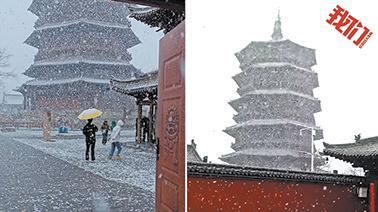 来源标题:山西朔州大雪纷飞千年应县木塔披上“白纱”
