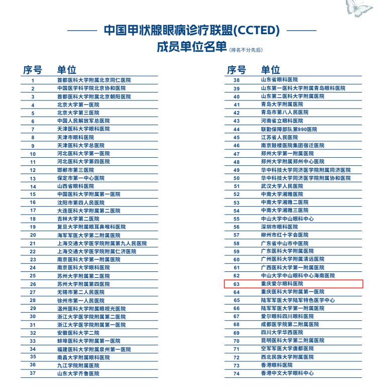 论坛期间,还正式颁布了中国甲状腺眼病诊疗联盟(CCTED)成员单位名单。重庆爱尔眼科医院凭借在甲状腺眼病诊疗领域的突出实力与扎实积累,成为成员单位之一。在袁洪峰教授的带领下,医院将持续对标国内外先进诊疗技术与规范,积极发挥联盟平台优势,进一步提升甲状腺眼病的综合诊疗能力,为重庆市乃至西南片区甲状腺相关眼病患者带来更高质量、更优体验的诊疗服务。