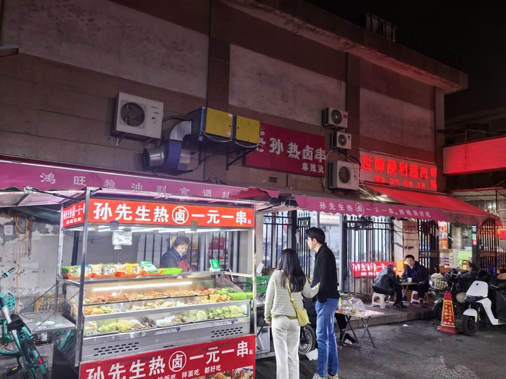 小店虽拥挤,却布置得井井有条:一台大冰柜占据一角,一排小桌子,除了供客人用餐,剩余空间还摆放着调味品和蔬菜等。门口连廊的货架上,整齐地码放着各种粮油米面。“这两天气温回升,晚上出来吃夜宵的人不少。”在仅有12平方米的串店里,老孙说,“最近生意挺不错,一天能卖七八百元呢。”