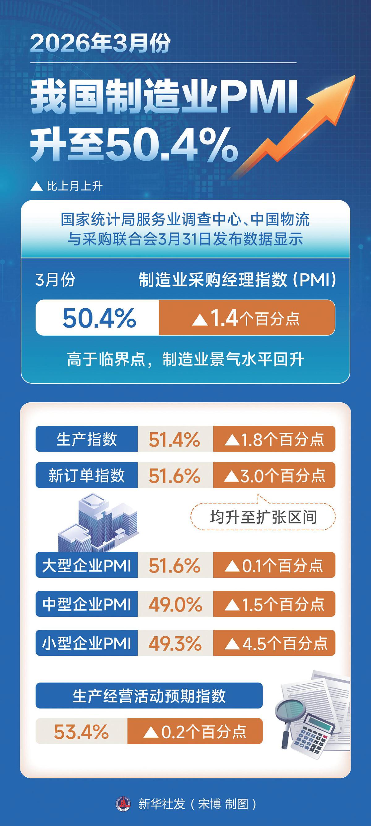 3月31日,国家统计局公布的数据表明,3月份,制造业采购经理指数(PMI)、非制造业商务活动指数和综合PMI产出指数均重返扩张区间,分别为50.4%、50.1%和50.5%,比上月上升1.4个、0.6个和1.0个百分点,我国经济景气水平回升。