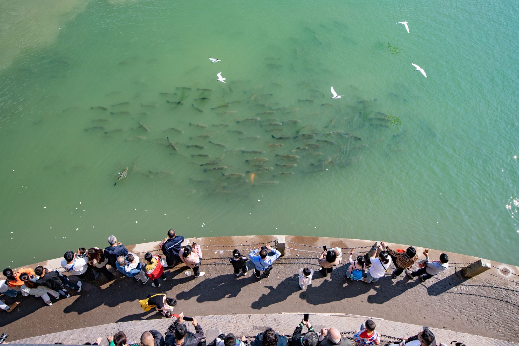 市民在三江口观赏红嘴鸥和鱼群。新华社发(彭珉翔 摄)