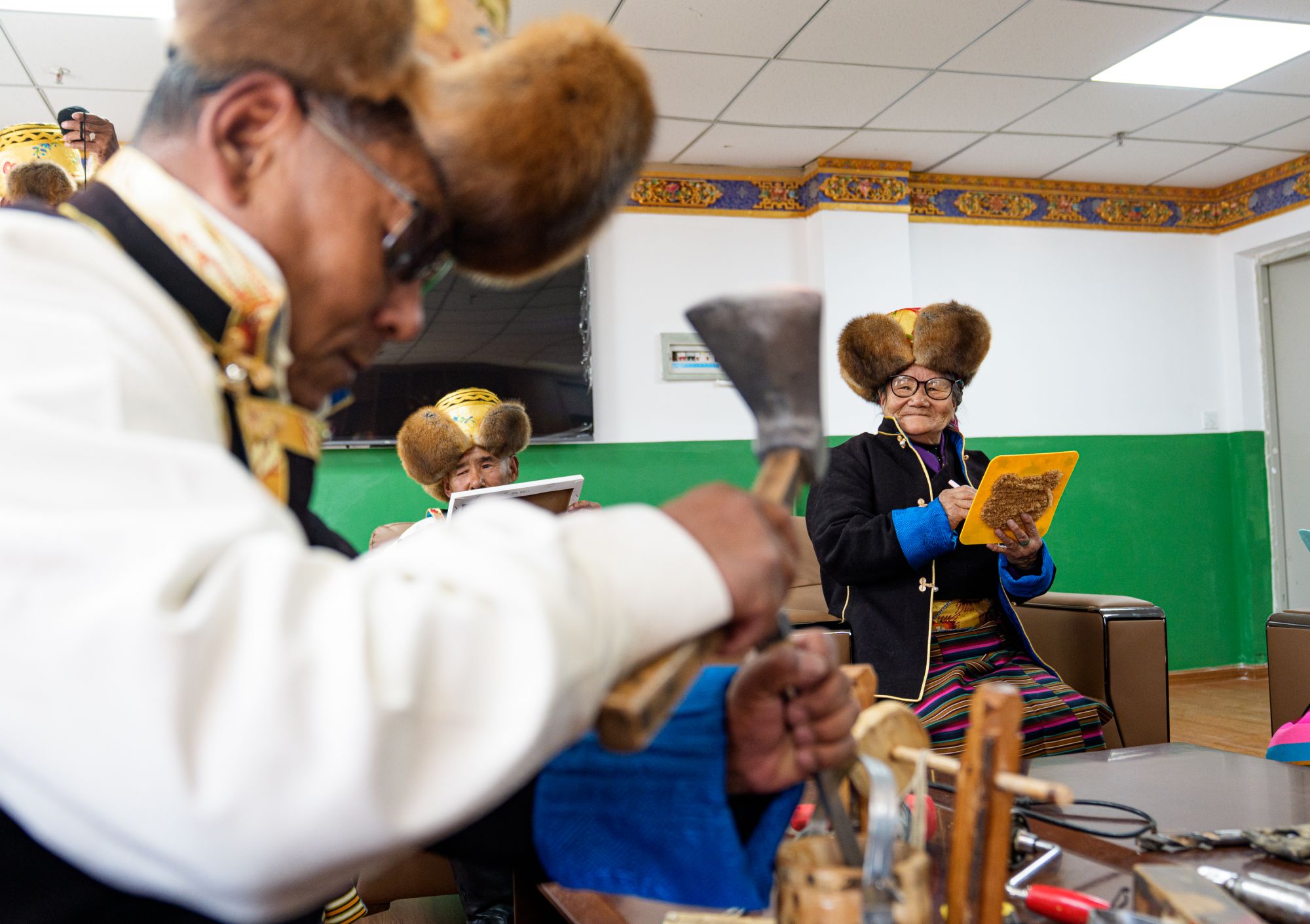 次德吉(右)在山南市桑日县特困人员集中供养中心和其他老人上手工课(3月25日摄)。