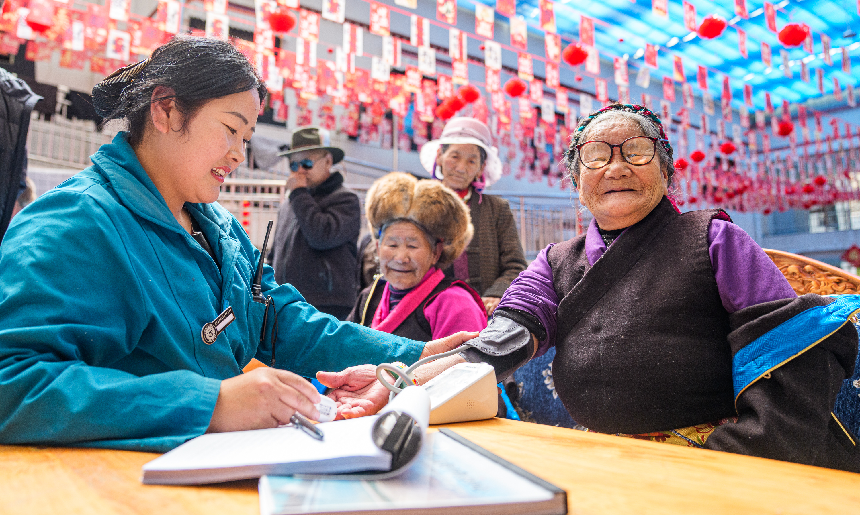 次德吉在山南市桑日县特困人员集中供养中心测量血压(3月25日摄)。