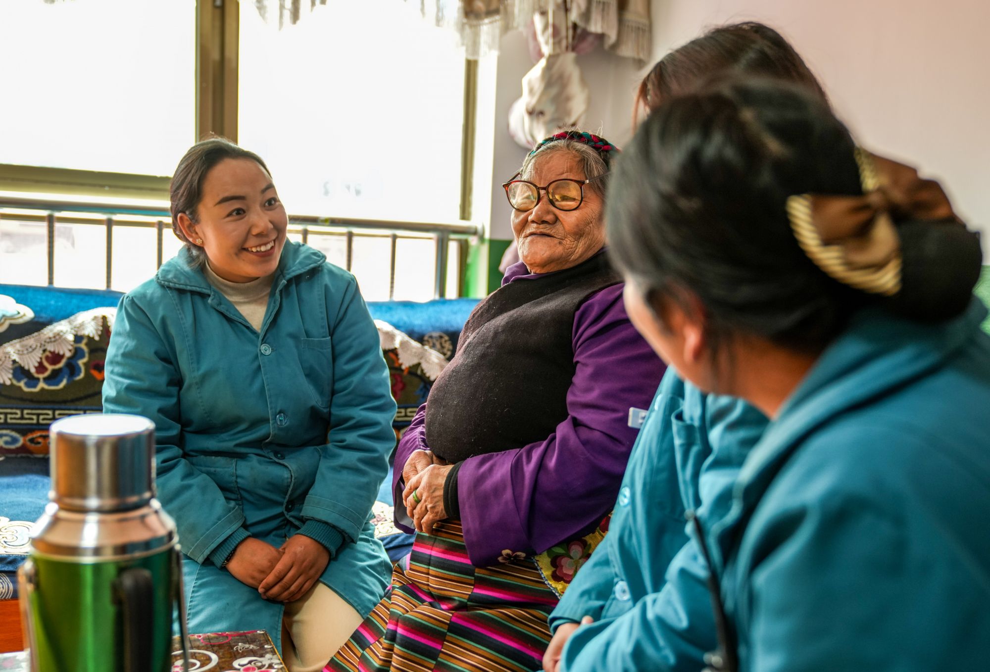 次德吉(左二)在山南市桑日县特困人员集中供养中心宿舍和工作人员拉家常(3月25日摄)。